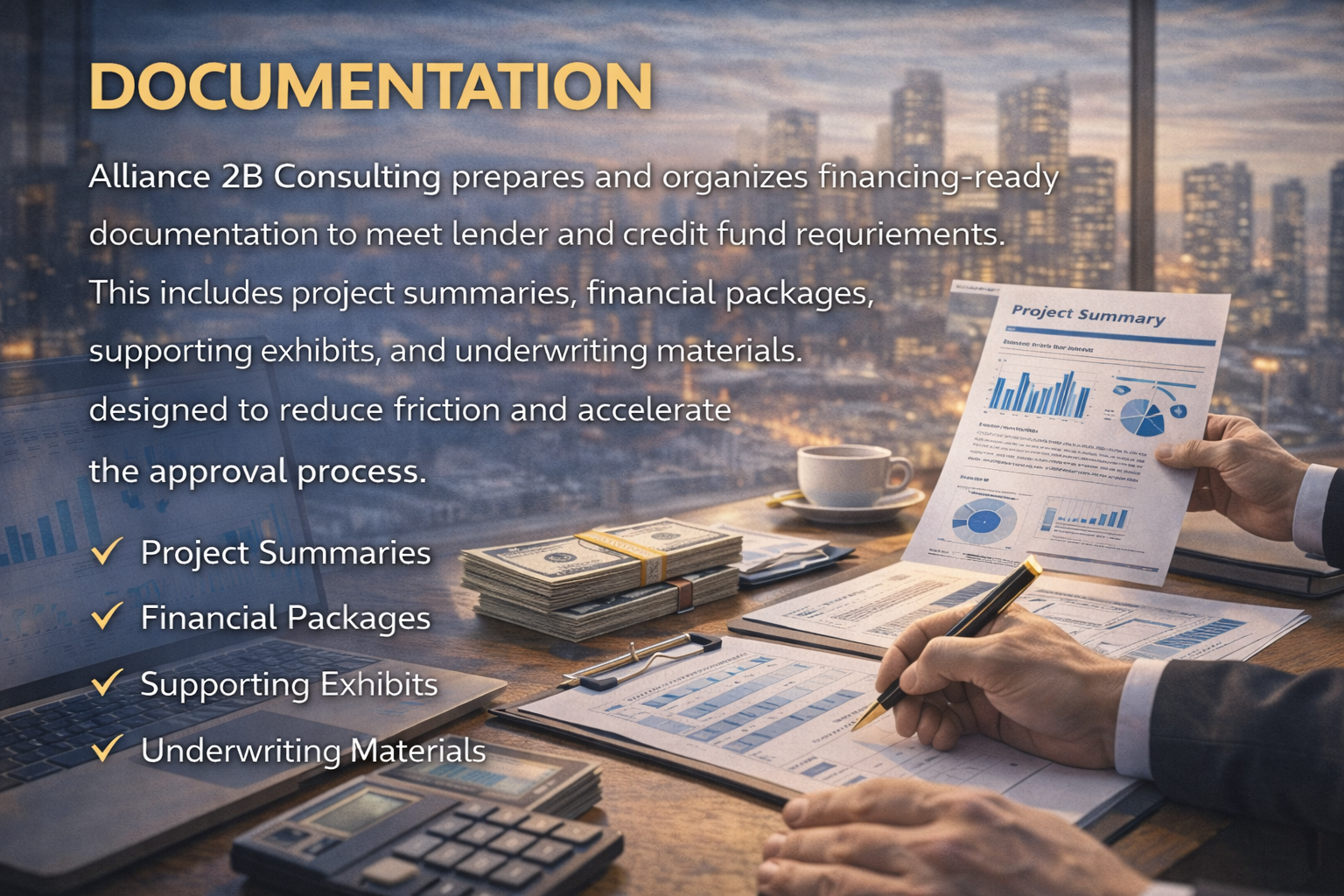 Alliance 2B Consulting prepares and organizes financing-ready documentation to meet lender and credit fund requirements. This includes project summaries, financial packages, supporting exhibits, and underwriting materials designed to reduce friction and accelerate the approval process.