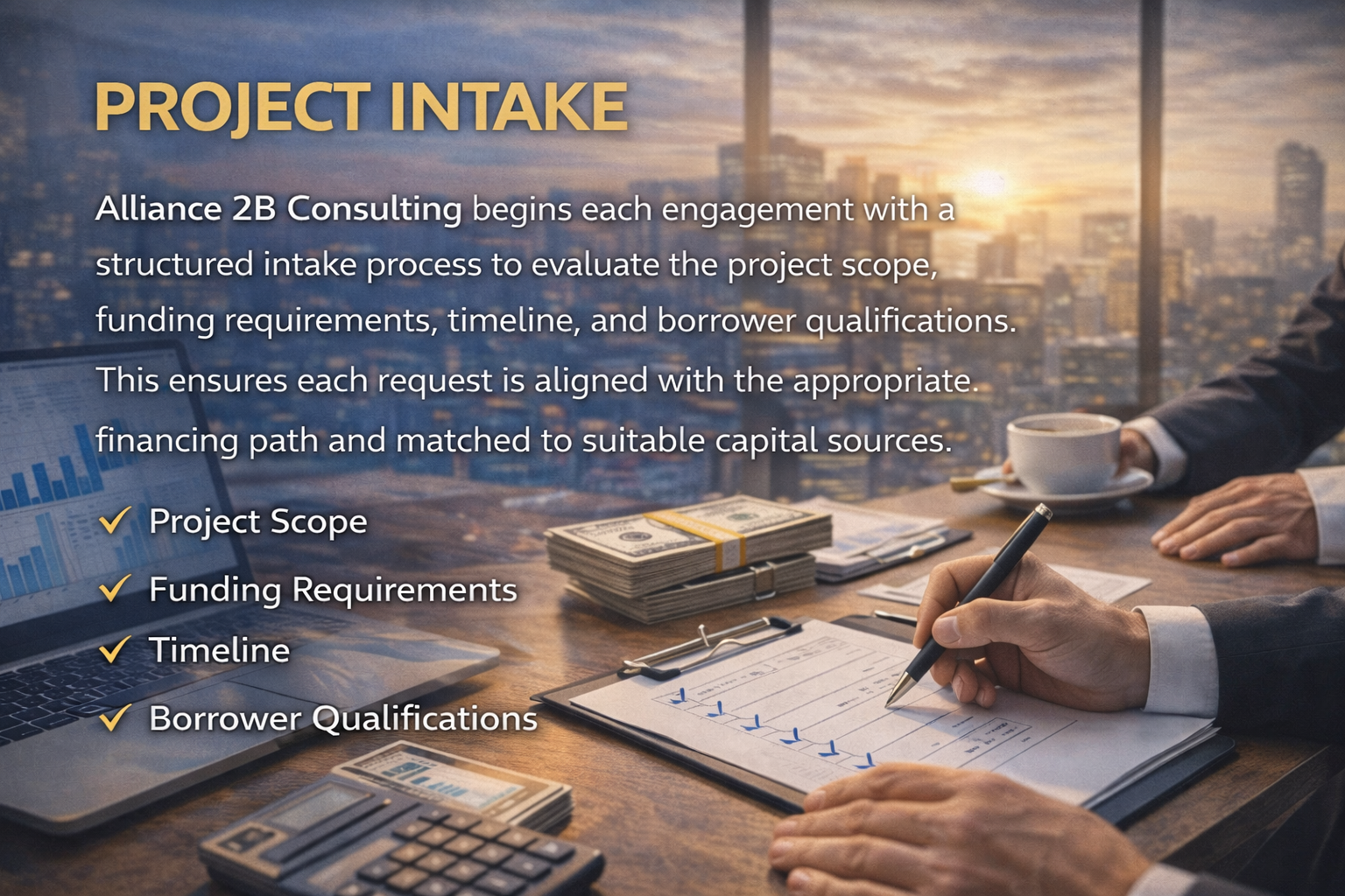 Alliance 2B Consulting begins each engagement with a structured intake process to evaluate the project scope, funding requirements, timeline, and borrower qualifications. This ensures each request is aligned with the appropriate financing path and matched to suitable capital sources.