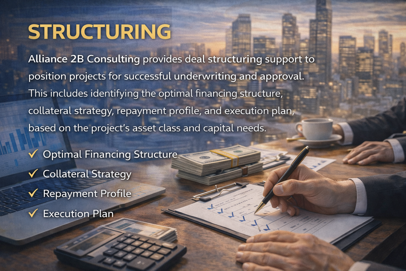 Alliance 2B Consulting provides deal structuring support to position projects for successful underwriting and approval. This includes identifying the optimal financing structure, collateral strategy, repayment profile, and execution plan based on the project’s asset class and capital needs.
