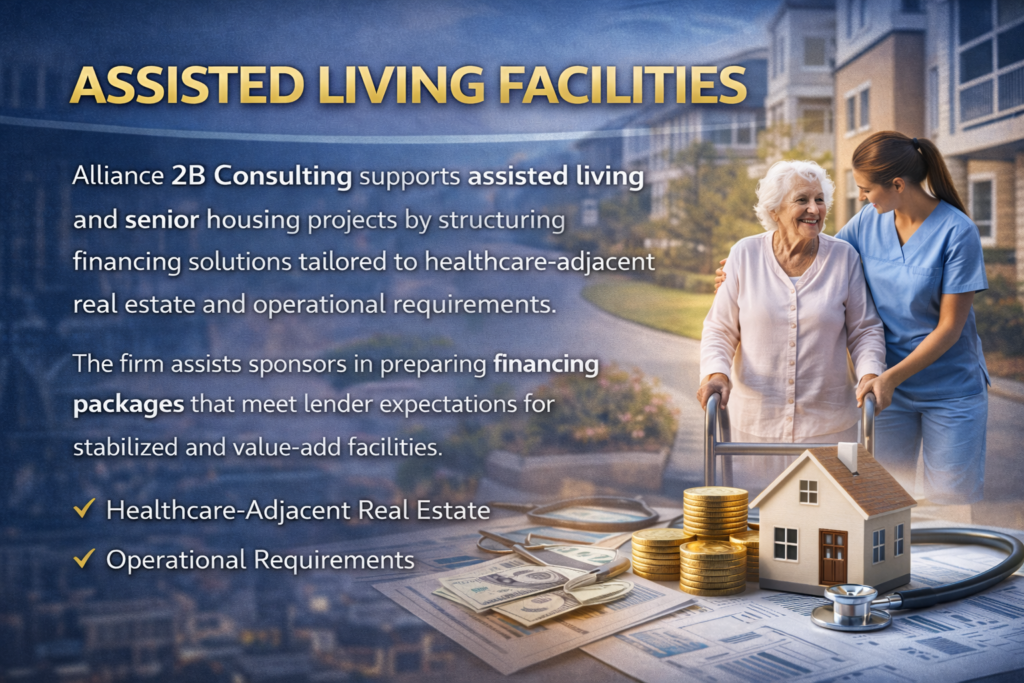 Alliance 2B Consulting supports assisted living and senior housing projects by structuring financing solutions tailored to healthcare-adjacent real estate and operational requirements. The firm assists sponsors in preparing financing packages that meet lender expectations for stabilized and value-add facilities.