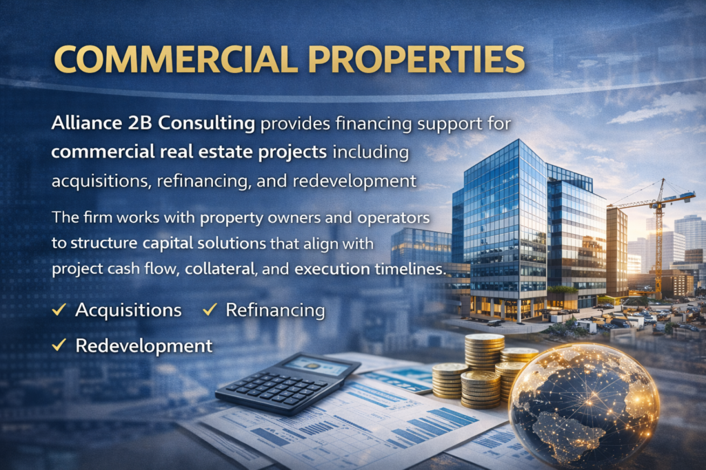 Alliance 2B Consulting provides financing support for commercial real estate projects including acquisitions, refinancing, and redevelopment. The firm works with property owners and operators to structure capital solutions that align with project cash flow, collateral, and execution timelines.