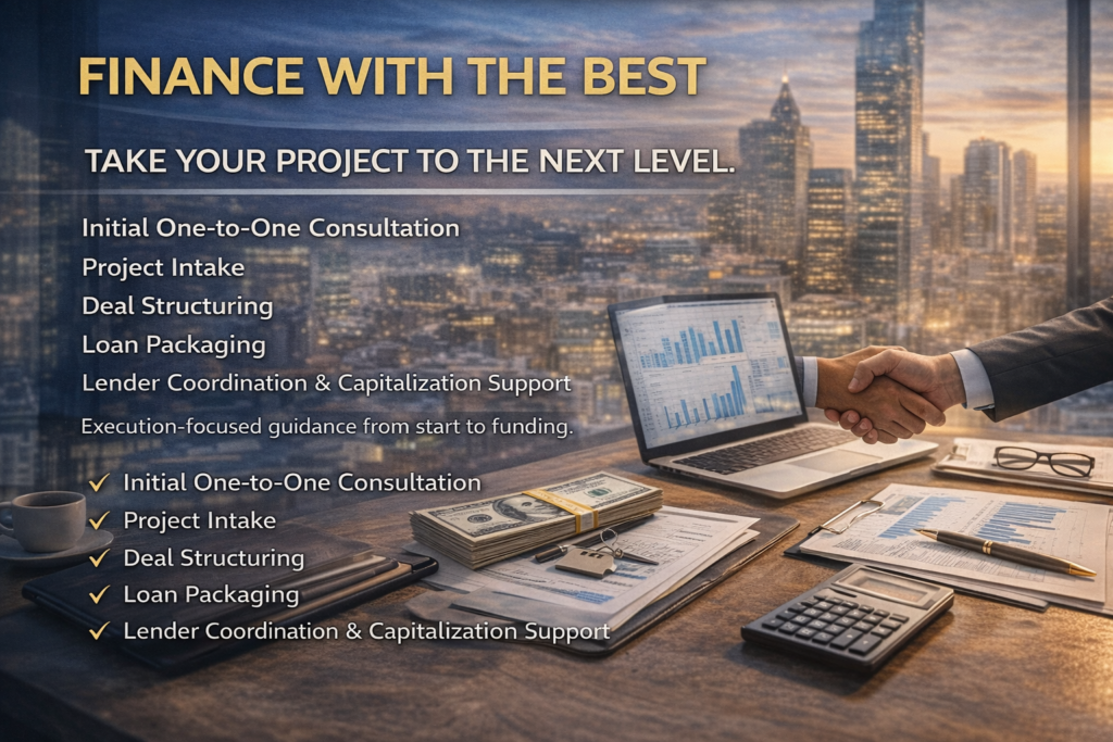 Initial one-to-one consultation, project intake, deal structuring, loan packaging, lender coordination, and capitalization support. Execution-focused guidance from start to funding.
