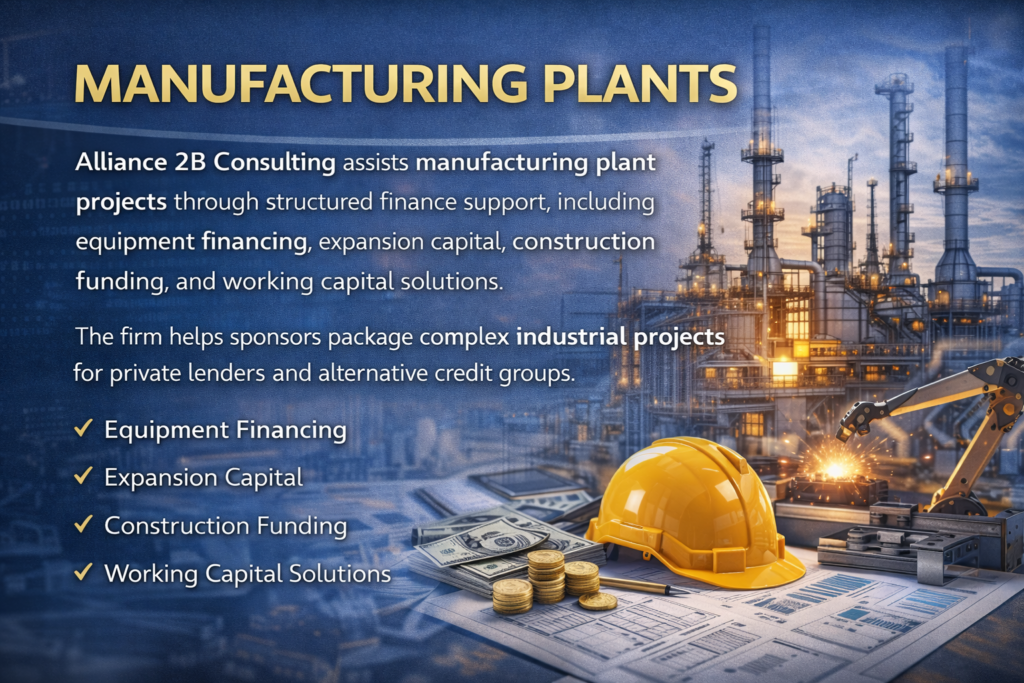 Alliance 2B Consulting assists manufacturing plant projects through structured finance support, including equipment financing, expansion capital, construction funding, and working capital solutions. The firm helps sponsors package complex industrial projects for private lenders and alternative credit groups.